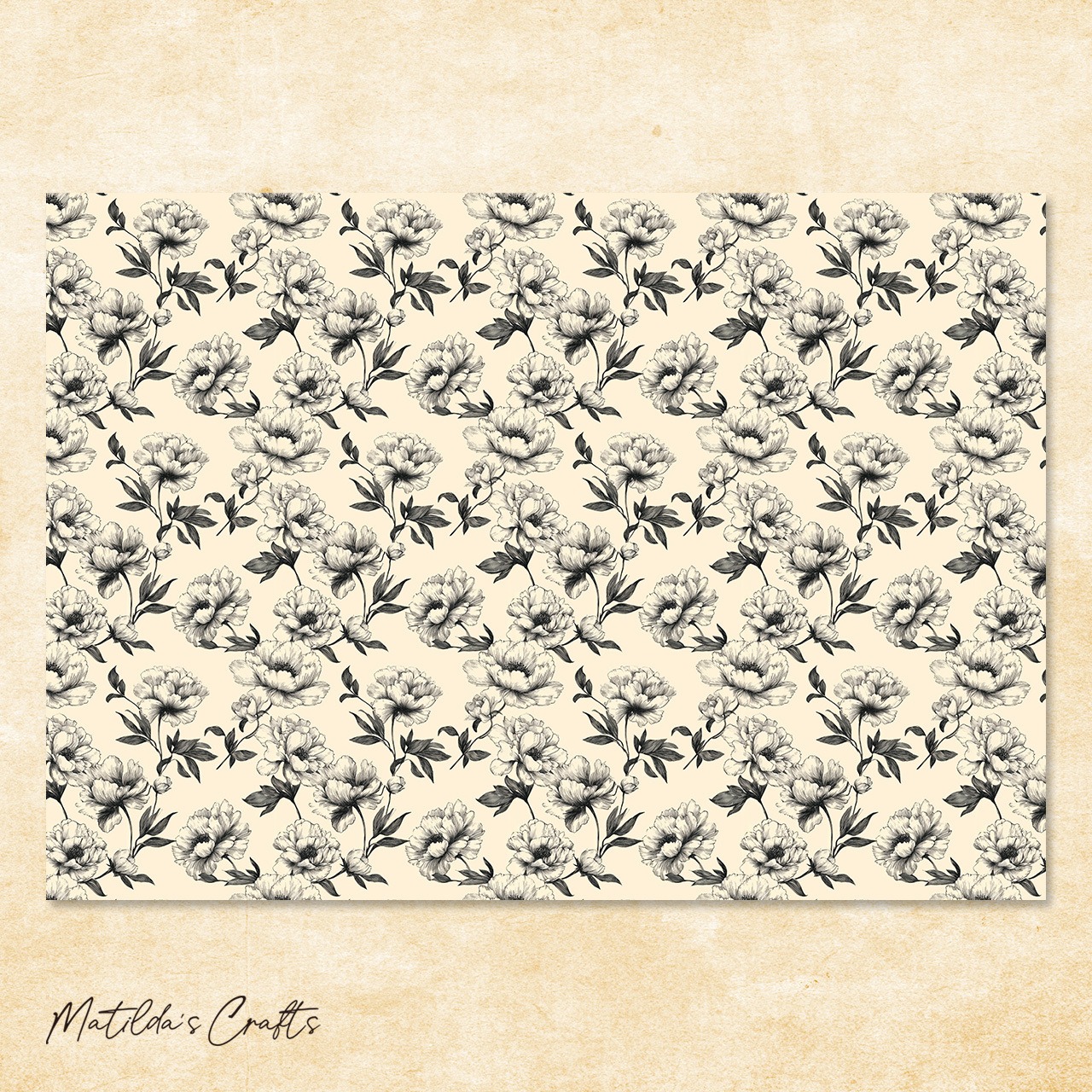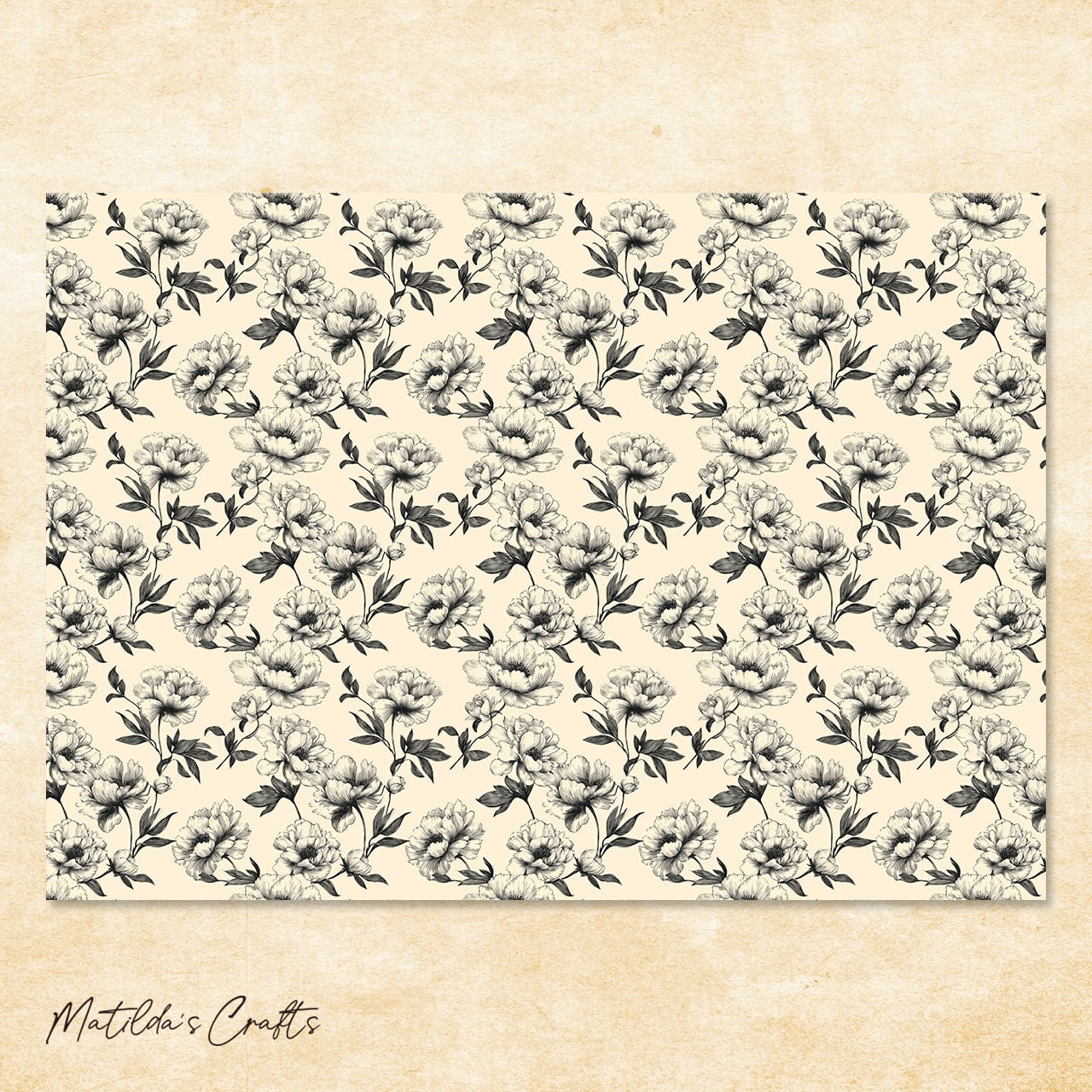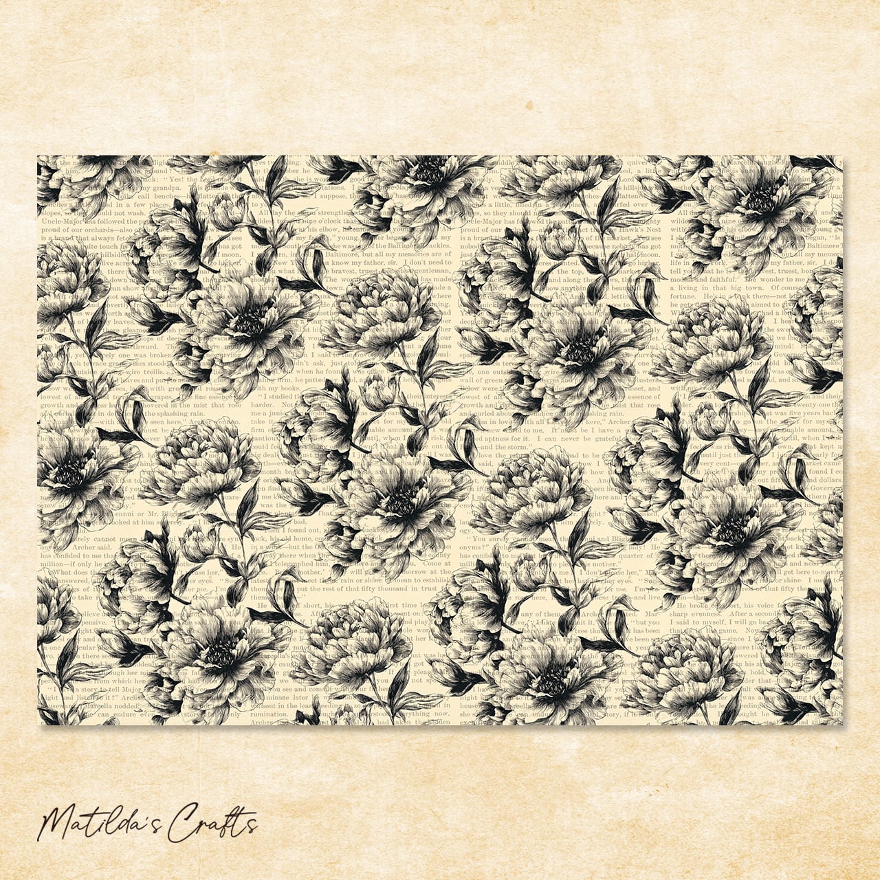 英字の背景に黒いお花がかっこいい花柄のデザインペーパーです。